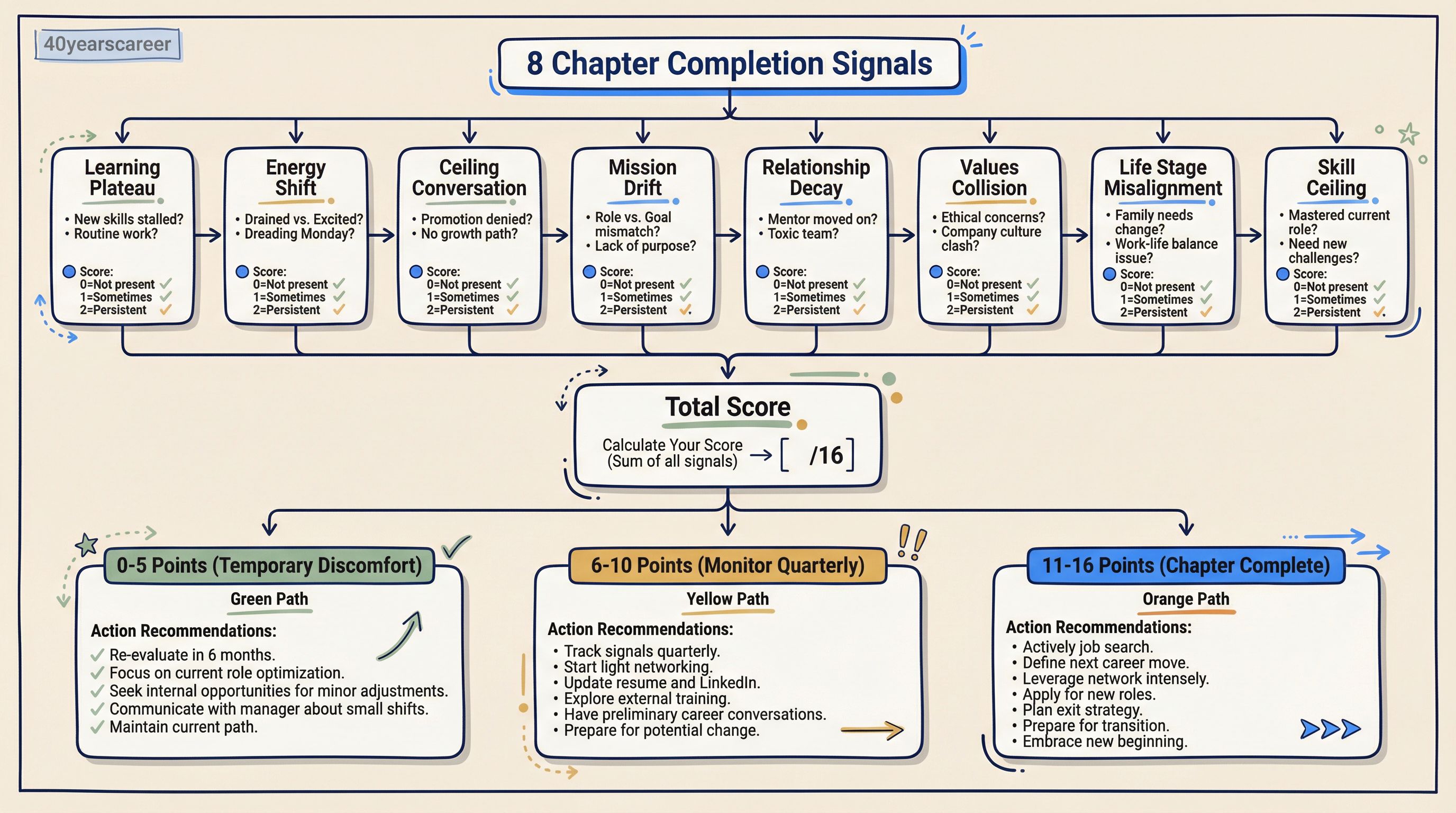 You're experiencing multiple persistent signals across several months. This isn't a bad week or a difficult project—it's structural misalignment. Time to plan your next chapter transition using the decision framework below.